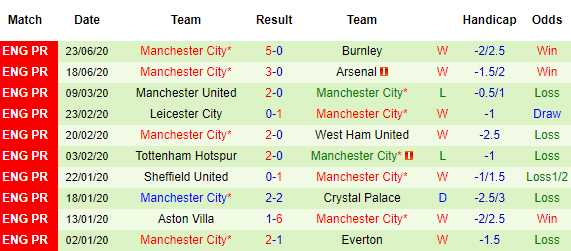 Bảng kèo 10 vòng gần nhất của Man City