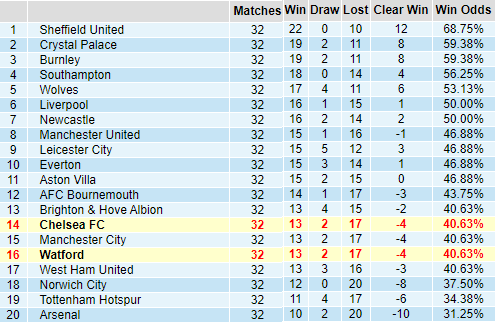 Mặc dù có sự chênh lệch lớn trên bảng xếp hạng của giải đấu nhưng Chelsea và Watford đều nằm ở nhóm dưới trong bảng thống kê thành tích kèo giải Ngoại hạng Anh. Hai đội hiện tại đều có 40.63% tỷ lệ thằng kèo ở thời điểm này, nếu chỉ tính trận đấu trên sân nhà thì Chelsea còn có kết quả tồi hơn với chỉ 37.50% thắng kèo. Watford cũng có tỷ lệ tương tự nếu tính các trận đấu trên sân khách mùa này.