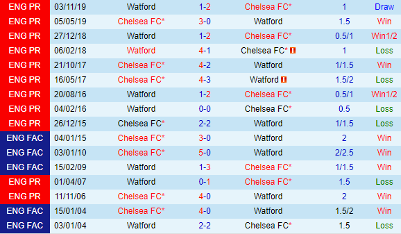 Ở thành tích đối đầu Chelsea đang là đội chiếm ưu thế khi giành chiến thắng 12 hoà 3 và thua 1 trong tổng cộng 16 cuộc đối đầu gần nhất. Nếu tính kết quả của trên sàn giao dịch đội chủ nhà cũng là đội giành chiến thắng nhiều hơn với 9 trận thắng 1 trận hoà và 6 trận thua trong tổng số 14 trận niêm yết trên sàn giao dịch gần nhất. Thành tích trên sân nhà của Chelsea còn ấn tượng hơn khi họ bất bại trước Watford với 7 trận thắng và 1 trận hoà, trong 8 trận đấu đó Chelsea thằng kèo châu Á 6 lần và thua 2.