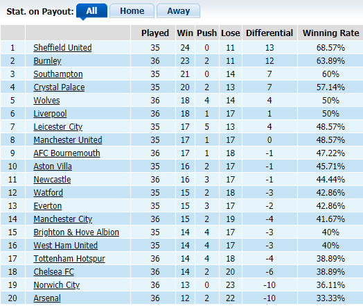 Trên BXH kèo châu Á, Crystal Palace đứng thứ 4 với tỷ lệ thắng kèo đạt 57,14%, trong khi Man Utd thắng kèo 48,57% từ đầu mùa. Ở BXH kèo sân nhà, Crystal Palace cũng đứng thứ 4 với việc vượt qua rào cản handicap ở 10/17 vòng đã qua. Còn với Quỷ đỏ thành Manchester, họ chơi không tốt trên sân khách khi chỉ có 6 lần thắng kèo trong 17 vòng xa nhà từ đầu mùa.