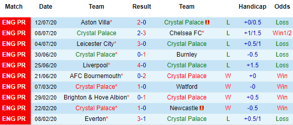 Bảng kèo 10 vòng gần nhất của Crystal Palace