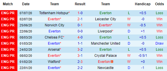 Bảng kèo 10 vòng gần nhất của Everton