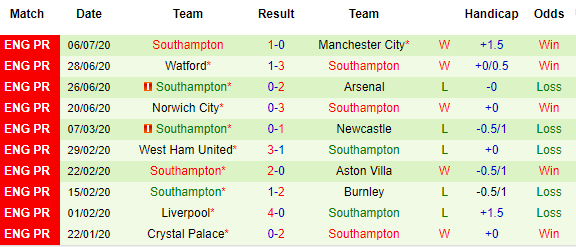 Bảng kèo 10 vòng gần nhất của Southampton