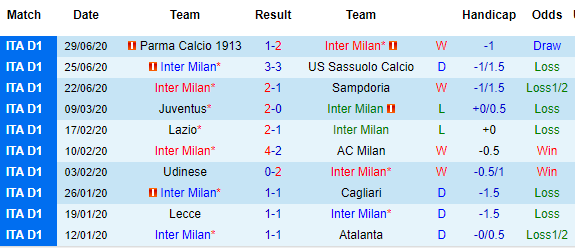 Bảng kèo 10 vòng gần nhất của Inter Milan