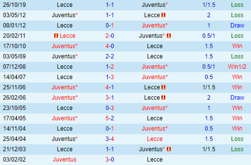 Trong đối đầu thì hai đội có thành tích tương đối cân bằng trên sàn giao dịch châu Á. với 7 trận thắng bên phía Juventus, 6 trận thắng bên phía Lecce và 2 lần hoàn trong tổng số 15 trận đối đầu gần nhất.