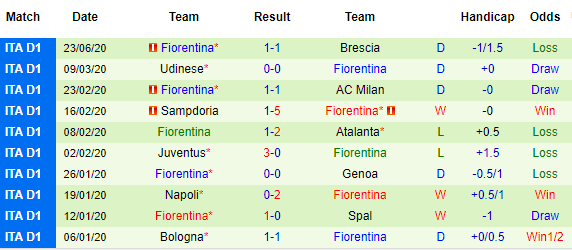 Bảng kèo 10 vòng gần nhất của Fiorentina