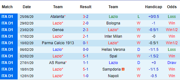 Bảng kèo 10 vòng gần nhất của Lazio