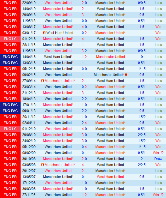 Trên bảng thống kê thành tích kèo châu Á của giải ngoại hạng Anh các cầu thủ Man Utd đang giữ vị trí thứ 6 với 50% tỷ lệ thắng kèo, trong khi đó West Ham đứng thứ 14 với 41.67% thắng kèo. Tỷ lệ thắng của Man Utd cao khi chi tính các trận đấu trên sân nhà của họ với 61.11% trận thắng thắng kèo đây cũng là tỷ lệ thắng trên sân nhà cao thứ 2 giải ngoại hạng, còn West Ham có thành tích khiêm tôn hơn khi chỉ có 44.44% tỷ lệ thắng kèo trên sân khách.
