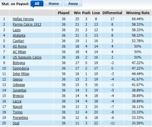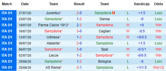 Ở BXH kèo châu Á, Sampdoria đứng thứ 10 với tỷ lệ 47,22% trong khi AC Milan xếp thứ 7 với tỷ lệ 50%, tương đương với việc thắng kèo 18/36 vòng đã qua. Sampdoria đạt tỷ lệ thắng kèo sân nhà là 44,44% trong khi đội bóng áo sọc đỏ đen thành Milan chơi khá tốt trên sân khách, thể hiện qua việc thắng tỷ lệ 61,11%, tương đương với 11/18 vòng xa nhà từ đầu mùa.