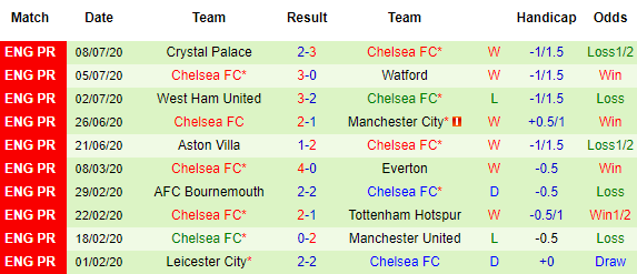 Bảng kèo 10 vòng gần nhất của Chelsea
