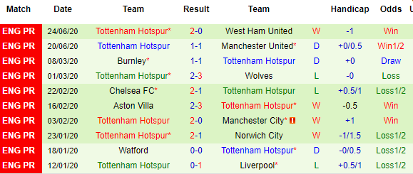 Bảng kèo 10 vòng gần nhất của Tottenham