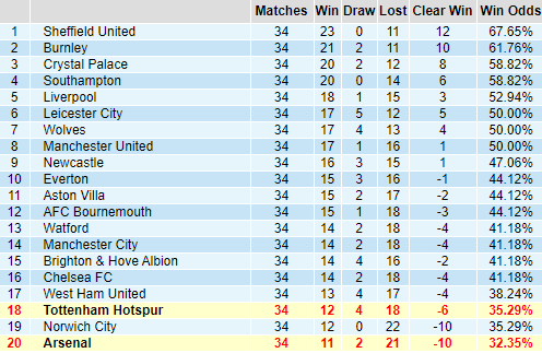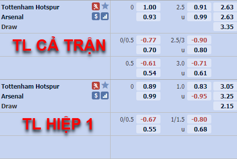 Nếu tính trên bảng thành tích kèo châu Á của giải ngoại hạng thì 2 đội đang nằm ở nhóm cuối BXH. Arsenal giữ vị trí cuối cùng với chỉ 32.35% tỷ lệ thắng kèo, Tottenham cũng chỉ nhỉnh hơn chút ít với tỷ lệ thắng 35.29%. Tỷ lệ thằng kèo trên sân nhà của Tottenham tốt hơn với 41.18% chiến thắng, Arsenal có tỷ lệ thắng kèo tương tự nếu chỉ tính các trận đấu trên sân khách của họ.