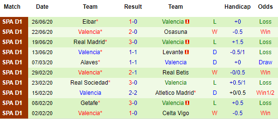 Bảng kèo 10 vòng gần nhất của Valencia tại La Liga