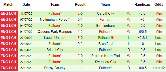 Bảng kèo 10 vòng gần nhất của Fulham