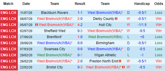 Bảng kèo 10 vòng gần nhất của West Brom