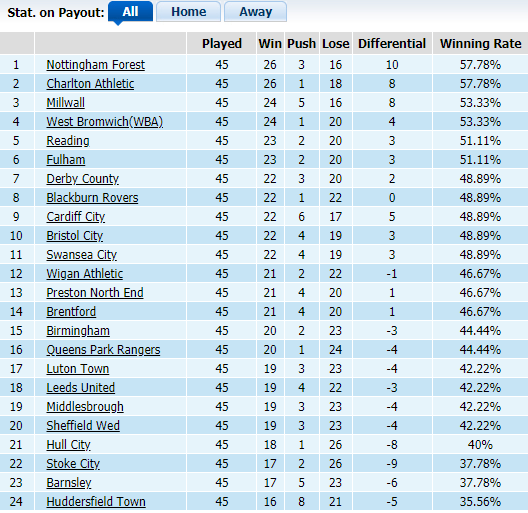 Trên BXH kèo tổng, West Brom đứng thứ 4 với tỷ lệ thắng kèo đạt 53,33% còn QPR xếp thứ 16 với tỷ lệ 44,44%. Ở BXH kèo sân nhà, West Brom đứng thứ 5 với tỷ lệ thắng kèo là 50% trong khi tại BXH kèo sân khách, QPR đứng thứ 12 và cũng vượt rào cản handicap một nửa số trận sân khách đã đấu (11/22 vòng).