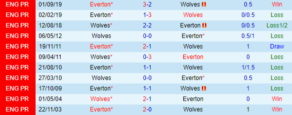 Vị trí của hai đội trên bảng thông kê thành tích kèo châu Á cũng gần tương đồng với bảng xếp hạng chính thức. Wolves đang đứng thứ 7 của giải đấu về tỷ lệ thắng kèo với 50%. Ở phía bên kia Everton có tỷ lệ thắng kèo 44.12% và đang là đội có tỷ lệ thắng kèo cao thứ 10 của giải Ngoại hạng Anh. Nếu chỉ tính những trận đấu trên sân nhà thì Wolves chỉ có được 35.29% tỷ lệ thắng, đây cũng là tỷ lệ thắng kèo của Everton nếu chỉ tính những trận đấu trên sân khách của họ.