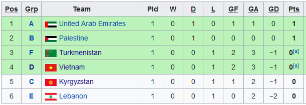 Đội tuyển Việt Nam đang tạm đứng thứ 4 trong số các đội ở vị trí thứ 3 sau lượt trận đầu tiên tại Asian Cup 2019.