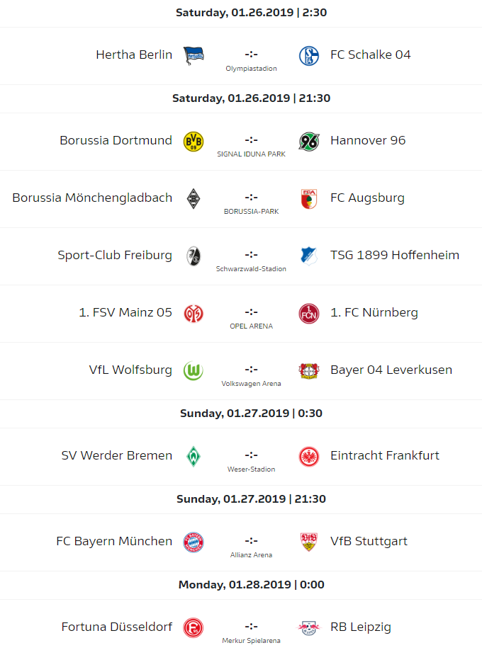 Lịch thi đấu vòng 19 giải VĐQG Đức