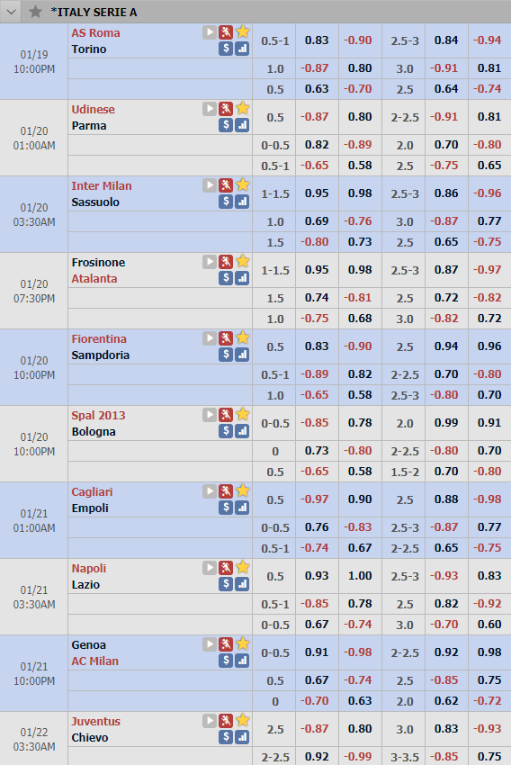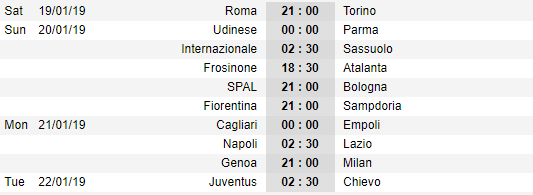 Cập nhật lịch thi đấu và tỷ lệ châu Á vòng 20 VĐQG Italia ( Serie A )