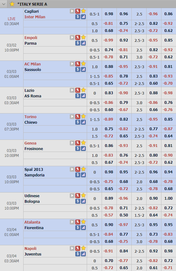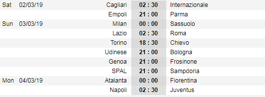 Cập nhật lịch thi đấu và tỷ lệ châu Á vòng 26 VĐQG Italia ( Serie A )