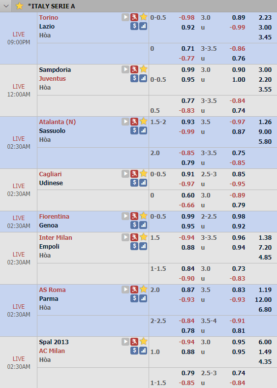 Cập nhật lịch thi đấu và tỷ lệ châu Á vòng 38 VĐQG Italia ( Serie A )