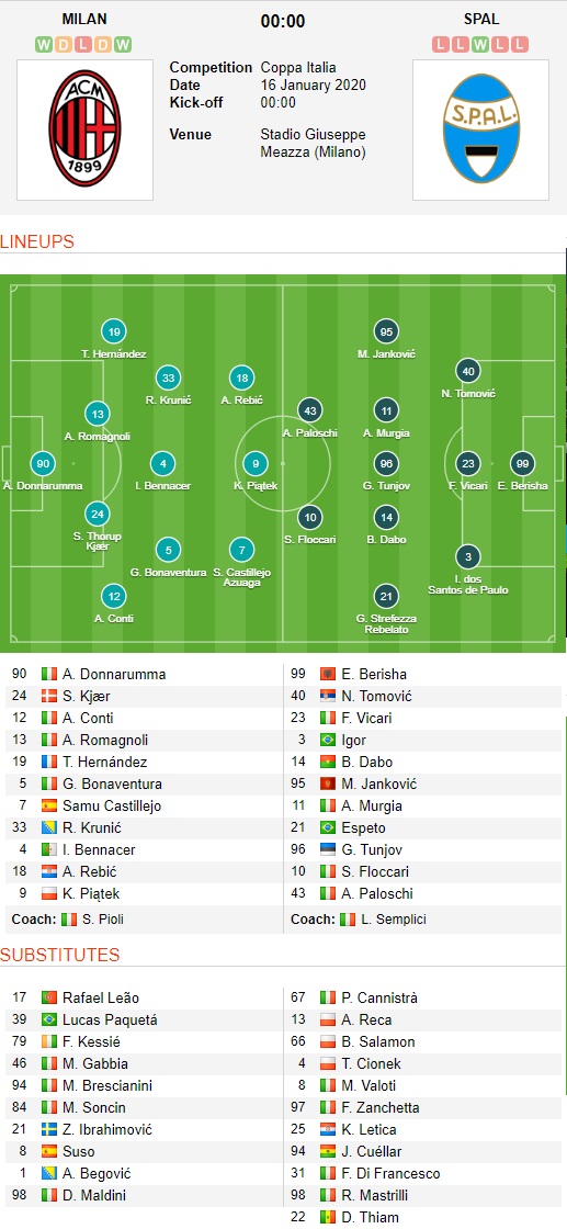 AEGoal.net cập nhật chính xác ĐỘI HÌNH RA SÂN trận AC Milan vs Spal diễn ra lúc 00h00 ngày 16/01 trong khuôn khổ Cúp QG Italia.
