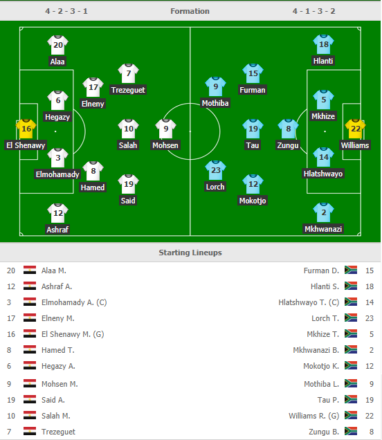 Ai Cập (4-2-3-1): El-Shenawy - Ashraf, Alaa, Hagazi, Mohamady - Hamed, Eleny - Trezeguet, Said, Salah - Mohsen