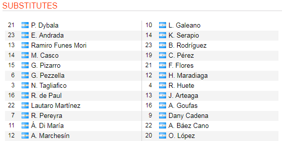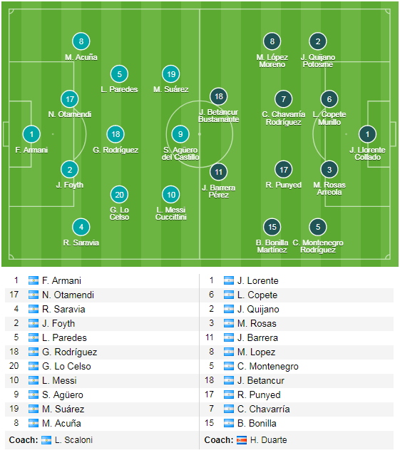 * Argentina (4-4-2): Armani; Saravia, Otamendi, Foyth, Tagliafico; Pereyra, Lo Celso, Paredes, de Paul; Aguero, Messi.