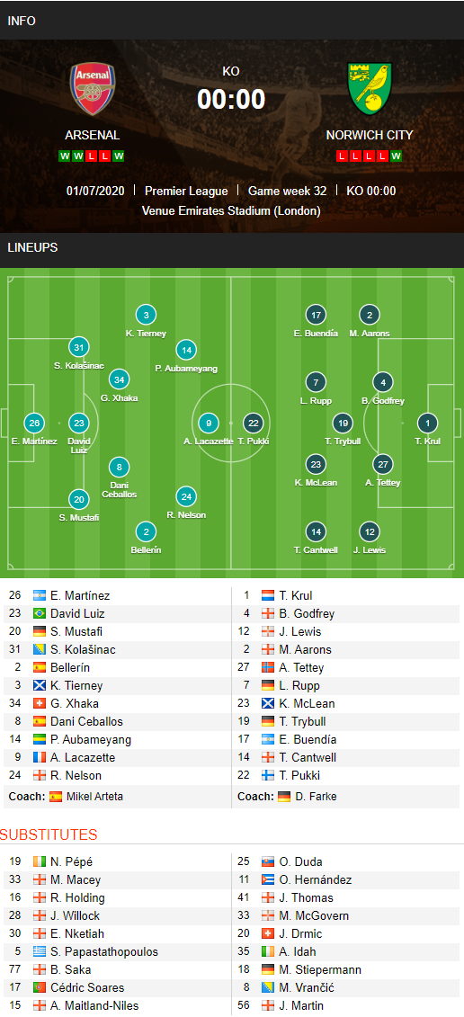 AEGoal.net cập nhật chính xác ĐỘI HÌNH RA SÂN trận Arsenal vs Norwich diễn ra lúc 00h00 ngày 02/07 trong khuôn khổ giải Ngoại hạng Anh.