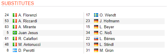 * AS Roma: Mkhitaryan, Zappacosta, Ünder, Pellegrini, Cristante, Kalinic, Amadou Diawara không thể thi đấu do chấn thương. Justin Kluivert đang dính án phạt tại giải quốc nội nhiều khả năng anh sẽ được đá chính trận này.