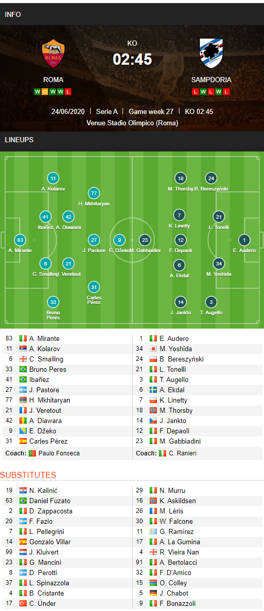 AEGoal.net cập nhật chính xác ĐỘI HÌNH RA SÂN trận AS Roma vs Sampdoria diễn ra lúc 02h45 ngày 25/6 trong khuôn khổ giải VĐQG Italia.