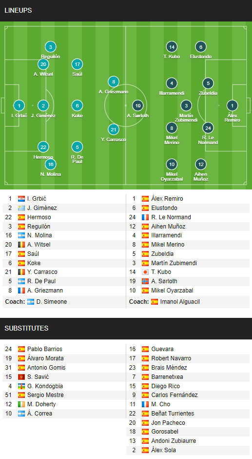 Atletico Madrid (5-3-2): Grbic; Molina, Gimenez, Witsel, Hermoso, Saul; De Paul, Koke, Carrasco; Correa, Griezmann.
