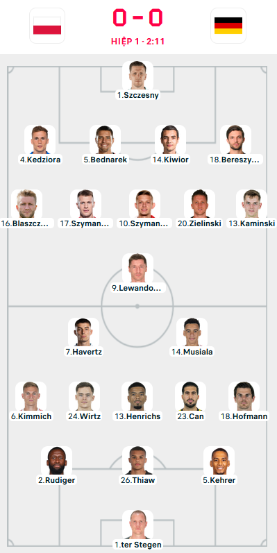 Ba Lan (4-3-3): Szczesny; Bereszynski, Bednarek, Wieteska, Kiwior; Swiderski, Linetty, Zielinski; Frankowski, Lewandowski, Zalewski.