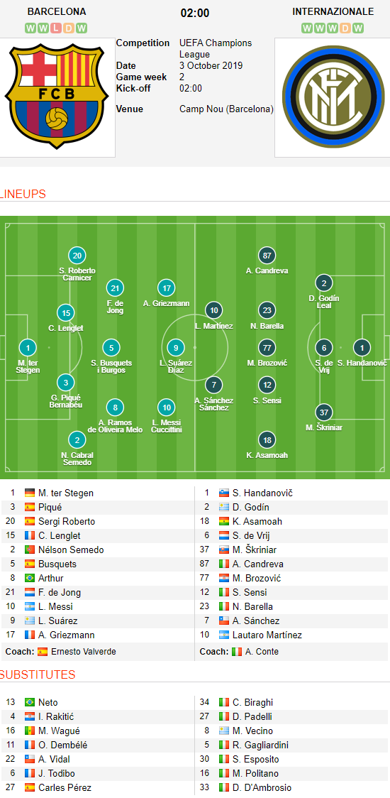 AEGoal.net cập nhật chính xác ĐỘI HÌNH RA SÂN trận Barcelona vs Inter Milan diễn ra lúc 02h00 ngày 03/10 trong khuôn khổ Vòng bảng UEFA Champions League.