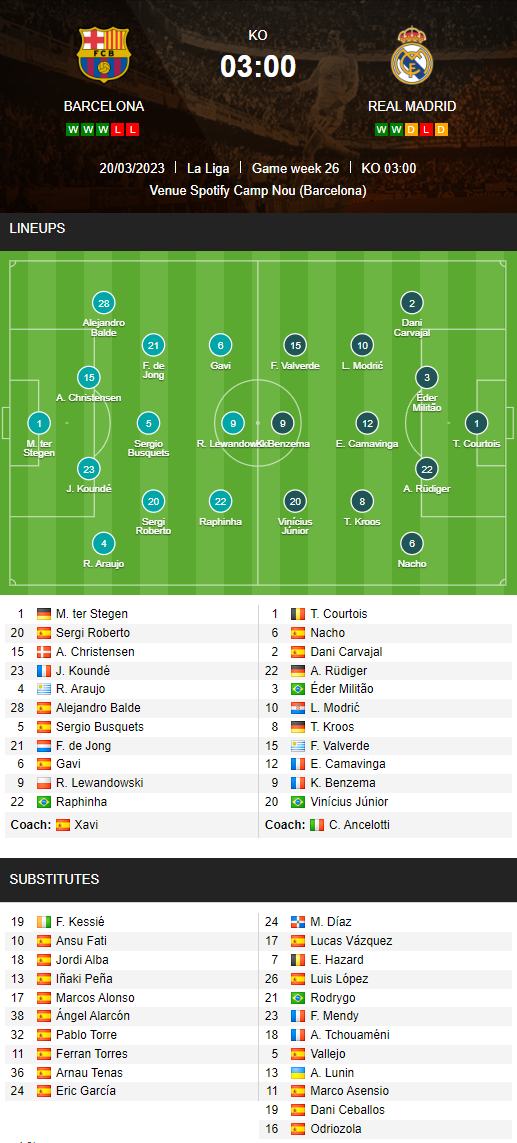 AEGoal cập nhật chính xác ĐỘI HÌNH RA SÂN trận Barcelona vs Real Madrid diễn ra lúc 03h00 ngày 20/03/2023 trong khuôn khổ giải VĐQG Tây Ban Nha.