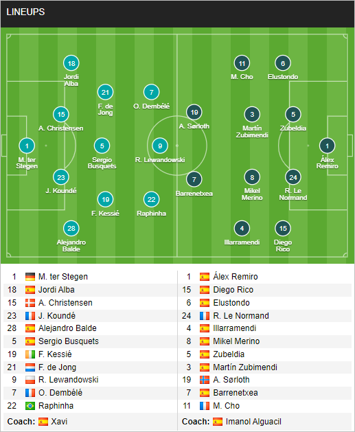 AEGoal cập nhật chính xác đội hình ra sân trận Barcelona vs Sociedad diễn ra lúc 02h00 ngày 21/5 trong khuôn khổ giải VĐQG Tây Ban Nha.