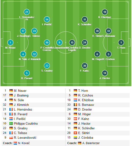 AEGoal.net cập nhật chính xác ĐỘI HÌNH RA SÂN trận Bayern Munich vs Cologne diễn ra lúc 20h30 ngày 21/9 trong khuôn khổ vòng 5 Bundesliga.