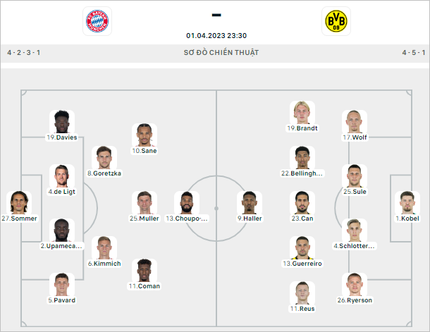 AEGoal cập nhật chính xác đội hình ra sân trận Bayern Munich vs Dortmund diễn ra lúc 23h30 ngày 01/04 trong khuôn khổ giải VĐQG Đức.