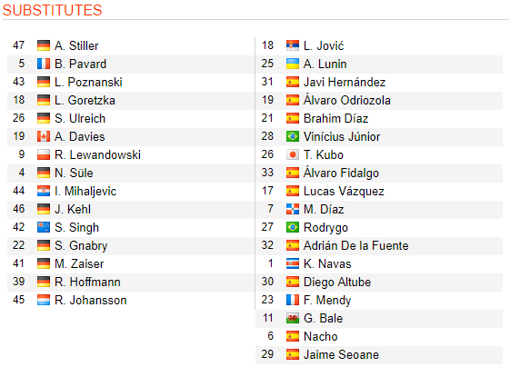 * Bayern Munich: Neuer; Kehl, Boateng, Martinez, Alaba; Ontuzans, Tolisso, Thiago, Johansson, Arp; Muller.
