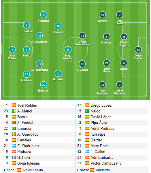 AEGoal.net cập nhật chính xác ĐỘI HÌNH RA SÂN trận Betis vs Espanyol diễn ra lúc 03h00 ngày 26/06 trong khuôn khổ giải VĐQG Tây Ban Nha.