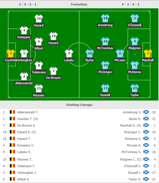 AEGoal.net cập nhật chính xác ĐỘI HÌNH RA SÂN trận Bỉ vs Scotland diễn ra lúc 01h45 ngày 12/6 trong khuôn khổ Bảng I - Vòng loại EURO 2020.