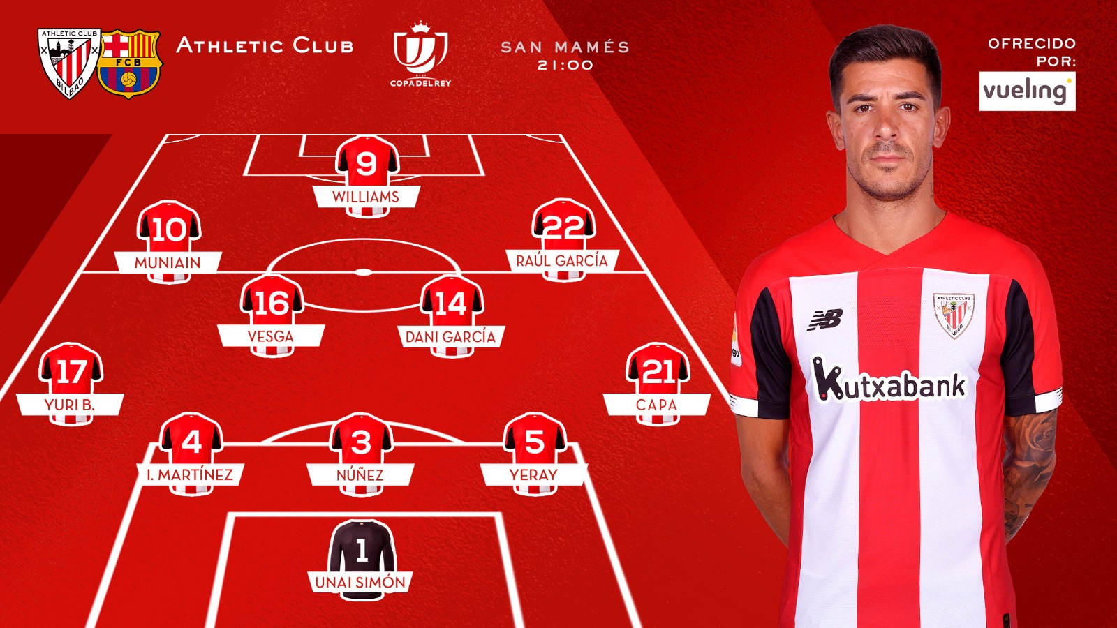* Bilbao: Simon; Capa, Alvarez, Martinez, Berchiche; D.Garcia, Lopez; Williams, R.Garcia, Muniain; Villalibre.
