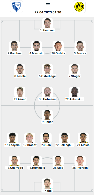Dortmund (4-3-3): Kobel; Ryerson, Sule, Hummels, Guerreiro; Bellingham, Can, Brandt; Malen, Haller, Adeyemi.