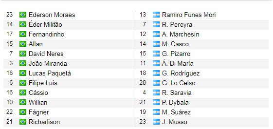 * Brazil (4-2-3-1): Alisson, Alves, Thiago Silva, Marquinhos, F.Luis, Arthur, Casemiro, Everton, Coutinho, Jesus, Firmino.
