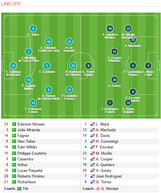 * Brazil (4-3-3): Alisson; Danilo, Thiago Silva, Miranda, Alex Sandro; Arthur, Casemiro, Coutinho; Richarlison, Gabriel Jesus, Firmino.