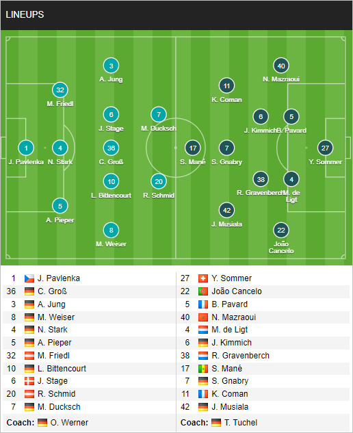 Bayern Munich (4-2-3-1): Sommer; Mazraoui, Pavard, De Ligt, Cancelo; Kimmich, Gravenberch; Coman, Gnabry, Musiala; Mane