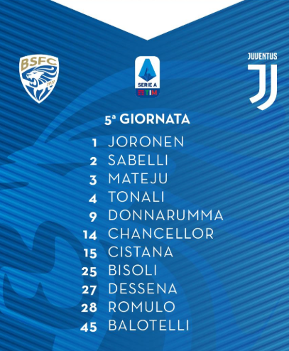 Brescia (4-3-1-2): Joronen - Sabelli, Cistana, Chancellor, Mateju - Bisoli, Tonali, Dessena - Romulo - Balotelli, Donnarumma