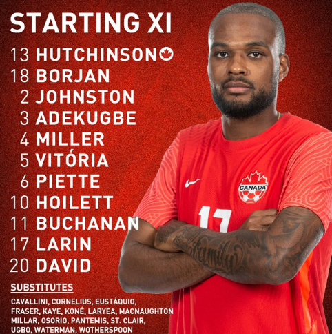 - Canada: Borjan; Miller, Vitoria, Johnston; Hutchinson; Laryea, Eustaquio, Kaye, Osorio; David, Larin.