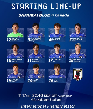 - Nhật Bản: Gonda; Sakai, Yoshida, Tomiyasu, H. Ito; W. Endo, Morita; J. Ito, Minamino, Kubo; Asano.